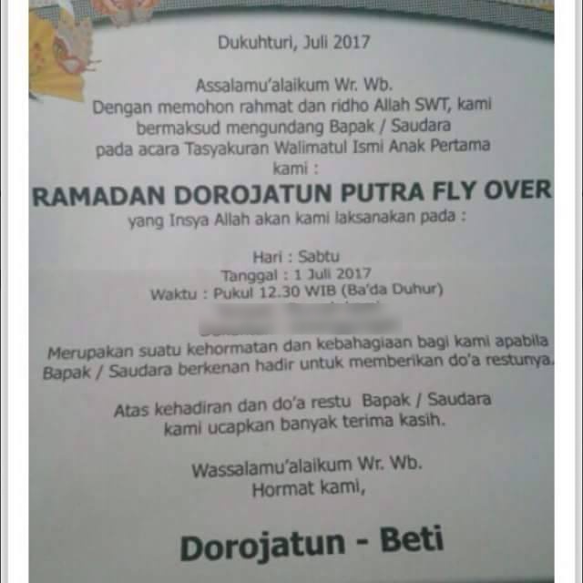 Keterangan akad nikah ini juga akan disertai dengan waktu dan tempat penyelenggaraan, sehingga tamu bisa mengetahui dengan detail kapan dan dimana akad. Selain dengan format.doc (microsoft word). Surat resmi biasanya digunakan untuk tujuan yang resmi, sementara surat tidak resmi. Kumpulan daftar nama nama bayi dan artinya ini berisi nama anak unik & keren. Contoh undangan syukuran pemberian nama contoh isi undangan. Sedang mencari contoh undangan tasmiyah dengan format word dan cdr? Kedua jenis surat ini memiliki peruntukan tersendiri dan tidak bisa digunakan pada sembarang tempat. Uploaded with the aid of. Download undangan aqiqah 1 download contoh undangan aqiqah 2 dowload undangan walimah aqiqah 3 i lembar 4 undangan download tulisan ucapan aqiqah untuk ditaruh dalam nasi kotak. Bagian ini perlu dicantumkan secara jelas agar nama dan pihak utama yang dituju tidak terjadi kesalahpahaman. Kumpulan contoh kartu ucapan pemberian nama bayi ala cuitan dokter. Kirim undangan yang dirancang dengan indah untuk tiap kesempatan, lebih praktis dengan ribuan contoh undangan canva yang didesain secara profesional dan dapat dicetak. Tujuannya untuk mengundang orang lain agar ketika menyembelih hewan qurban aqiqah, diniatkan sambil menyebutkan nama bayi dan ayahnya.