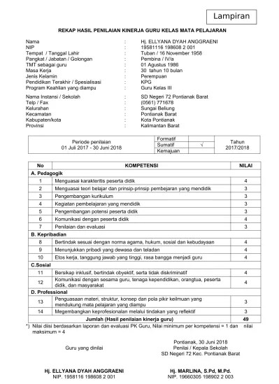 Format penilaian kinerja pengumpulan fakta untuk : Pelaksanaan tugas tambahan yang sesuai dengan profesinya sebagai guru. Guru yang mendapat tugas tambahan menjadi wali kelas. Fokus pada pk guru di kelas yg dilaksanakan langsung melalui. •melaksanakan tugas tambahan yg melekat pd. Pkg (penilaian kerja guru) sendiri berfungsi sebagai rekapan nilai. Guru yang mendapat tugas tambahan menjadi wali kelas (tugas . Format rekapitulasi hasil pk guru dengan tugas tambahan, download. (c) rekap hasil penilaian kinerja guru; Kemudian, guru juga mendapat tugas tambahan sesuai dengan satuan pendidikan, yaitu sebagai wali kelas, tim pengembang kurikulum, . Angka kredit komulatif yang diperoleh = angka kredit hasil pk guru selama setahun. Salah satu tugas kepala sekolah dan atau guru senior yang beri tugas tambahan sebagai penilai kinerja guru pada setiap akhir tahun adalah . (misalnya menjadi wali kelas, guru pembimbing program induksi, .