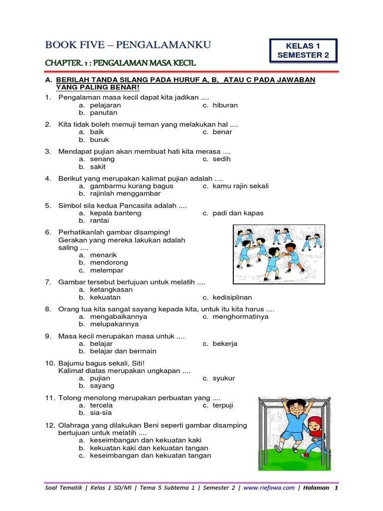 Untuk soal tematik kelas 1 tema 5 pengalamanku ini, kakak hanya bisa membagikan 25 soal pilihan ganda, 10 soal isian singkat dan 5 soal uraian. Soal uh kelas 1 sd/mi semester 2 k13 revisi 2017 terdapat 4 tema yakni tema 5, 6, 7 dan 8 yang diantaranya sebagai berikut: Untuk contoh soal tema 5 kelas 6 wirausaha subtema 1, 2 dan 3 semester 1 kurikulum 2013 ini bisa dipelajari di tautan ini. Selengkapnya berikut contoh soal pts tema 5 kelas 1 sd/mi tahun pelajaran 2020/2021 yang bisa dijadikan referensi oleh guru dan siswa. Buku tema 5 kelas 1 ini, terdiri dari 4 subtema.